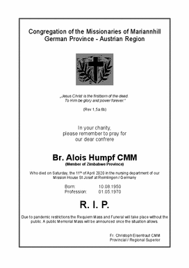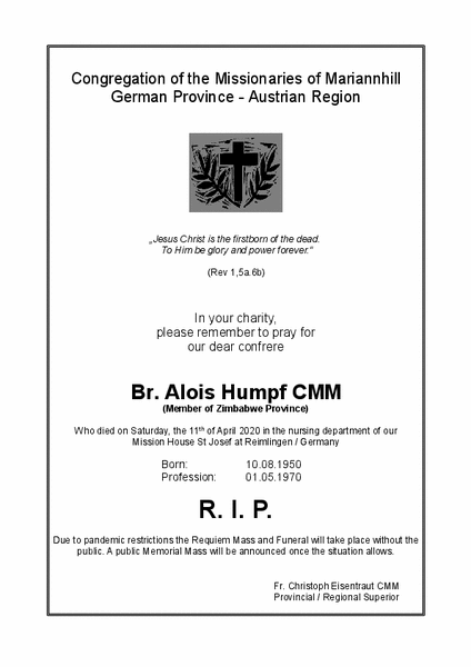 Br. Alois, ein guter Freund von Hans Schales und uns allen, ist heute Nacht in Reimlingen gestorben.