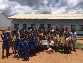 Im Namen der proWIN Stiftung überreicht Greta Panter den Lehrern und Schülern der Malumba Grundschule einen symbolischen Scheck über 5.000 Euro.