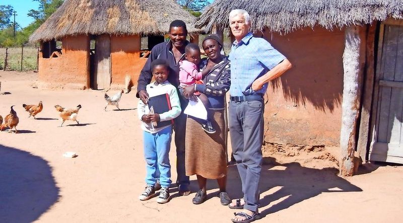 Neun Hühner, zwölf Kühe, eine Katze und ein kleiner Hund tummeln sich auf dem umzäunten Gelände mitten im Nirgendwo. Der weißbraune Hund heißt Bodyguard. Er kommt bellend angerannt, als Dr. Hans Schales mit mir im Jeep auf das Gelände mit vier Hütten fährt. Als wolle er uns sagen: „Stopp! Ich bewache unser Anwesen.“ Andrew Ngwenya kommt mit seiner drei Jahre alten Nichte Abigirl auf dem Arm aus einer Lehmhütte. Der 51-jährige Familienvater hat unser Auto gehört. Oder seinen bellenden Bodyguard. Wir steigen aus. Was macht der vierbeinige Wächter? Er legt sich in den Sand, lässt sich kraulen.