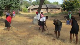 25 Frauen säubern den neuen Spielplatz hinter dem Steinhaus von Dr. Schales.