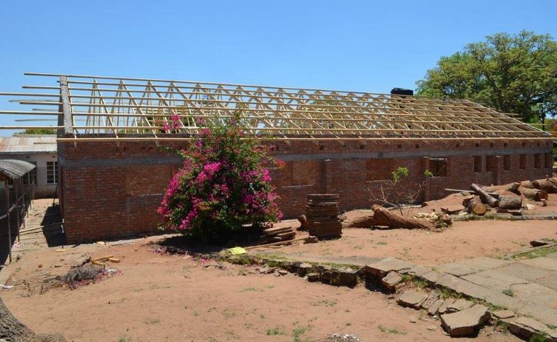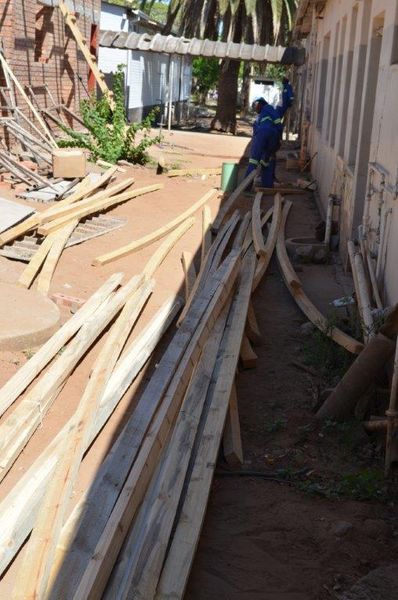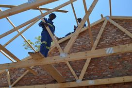 Mittlerweile sind die Arbeiter beim Bau der Dachkonstruktion angekommen.